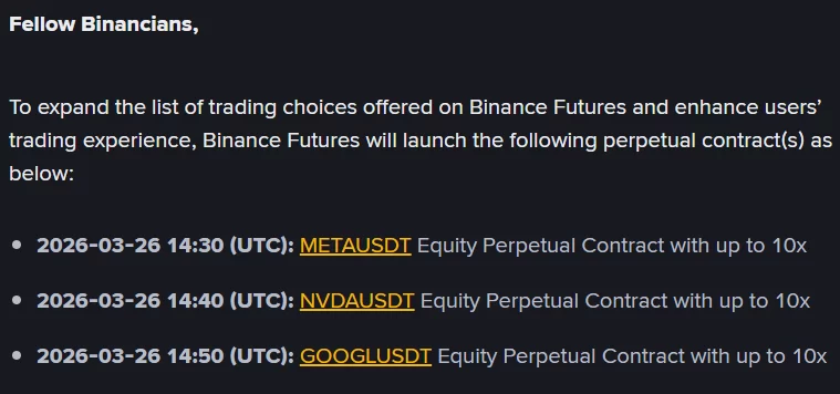 At launch, Binance will introduce futures contracts linked to the following pairs: METAUSDT, NVDAUSDT, and GOOGLUSDT. This selection signals a clear emphasis on the world’s most closely watched technology companies.