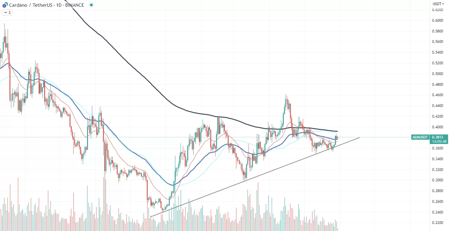 The DeFi boom on the Cardano blockchain has been a significant driving force for the increase in the Total Value Locked (TVL) on the network. Additionally, ADA, the network’s native asset, is showing strong performance, with upward movement bouncing from a support trend line set around $0.35.
