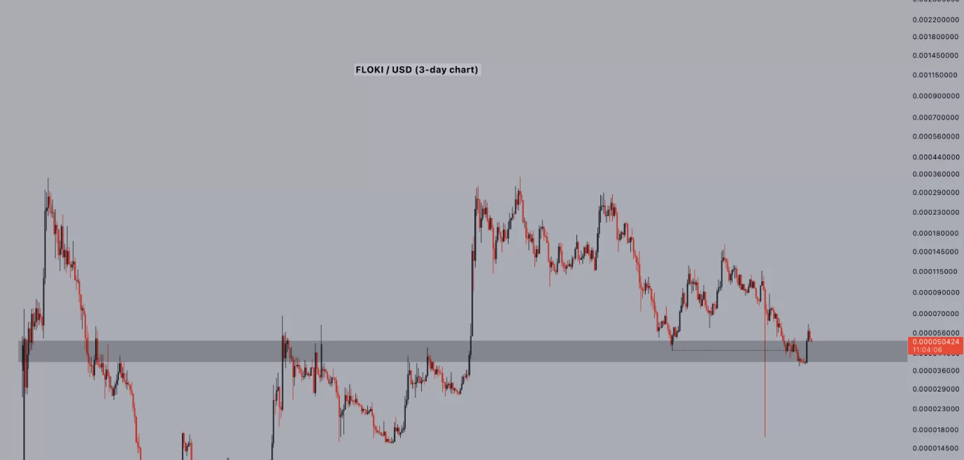 FLOKI remains in discussions today, with analysts reassured by its position against the bear market ceiling support. Analyst Jelle expressed satisfaction, suggesting the distinctive deviation might serve as the fuel needed to push higher.