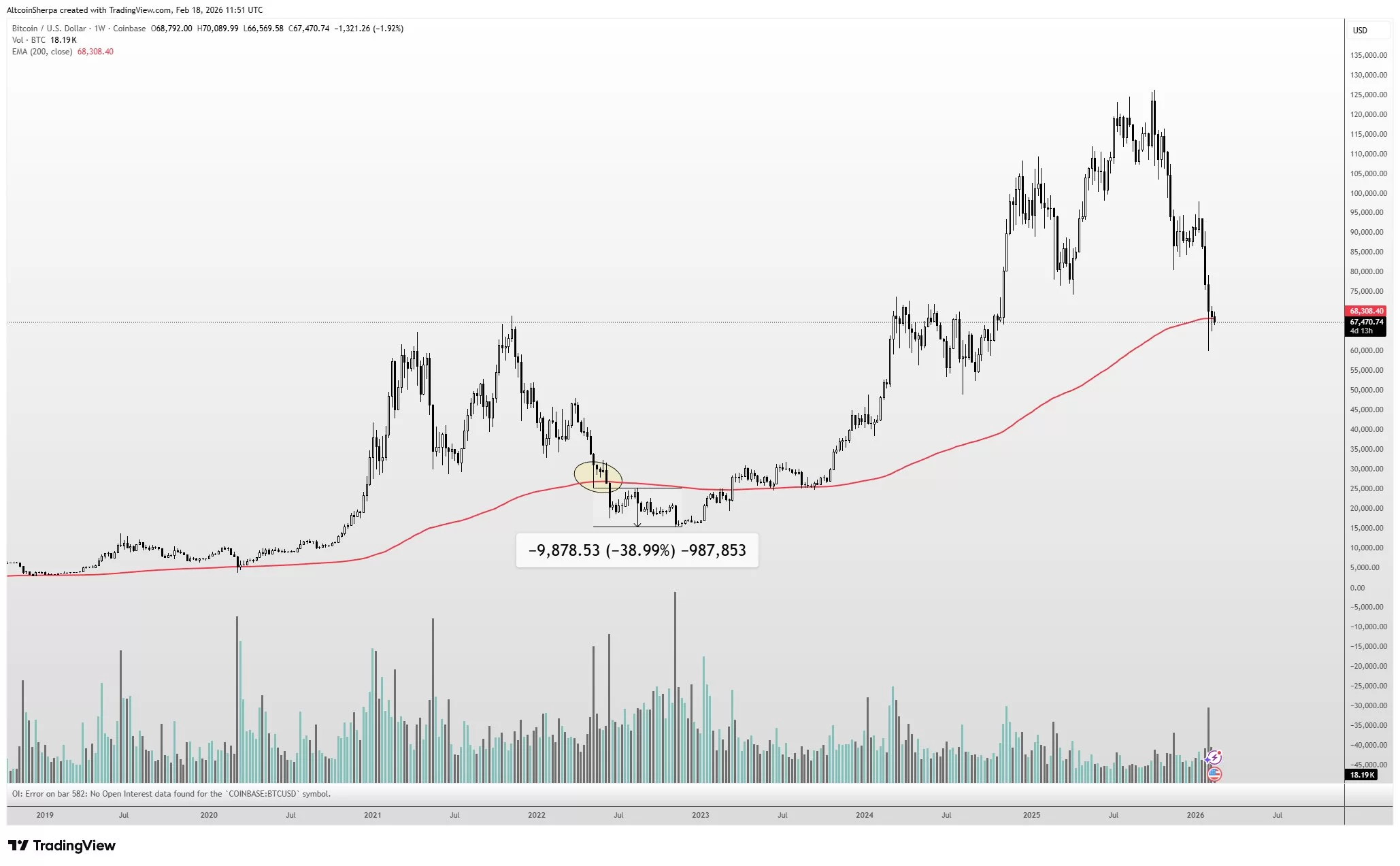 According to Sherpa, “Bitcoin’s price is currently sitting at the 200-week EMA. Historically, this is an area where it may make sense to watch for possible entry points. As seen in 2022, we could see a drop as steep as 40% under the EMA. Although I don’t expect such a dramatic decline this time, a move below the $50,000–$70,000 range remains a realistic possibility.”