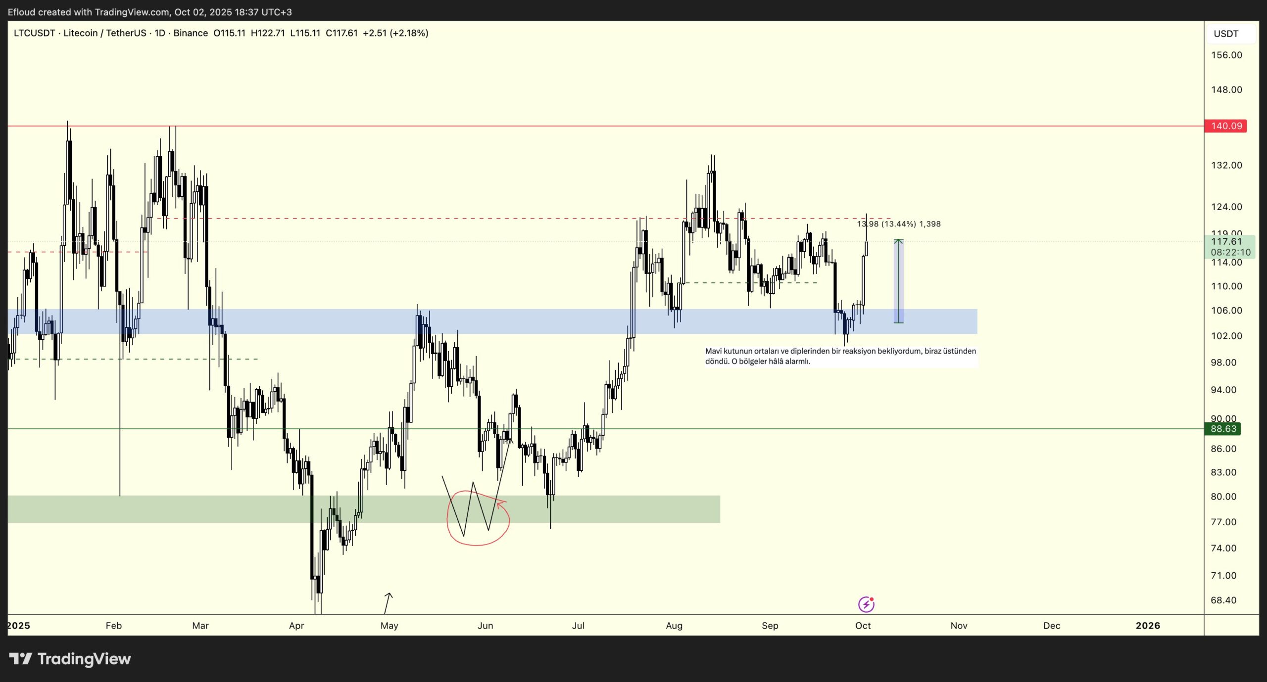 Efloud, a notably precise analyst, reveals a strategic play with LTC following recent price volatility. Having sold at $118 with a 13.4% gain, he plans to repurchase at the $108 level. In an environment where blue box resistance regions are seen as sell opportunities, double-digit short-term gains can be seized. Long-term investors will keep an eye on the anticipated LTC ETF approval, potentially signaling a surge of institutional interest.