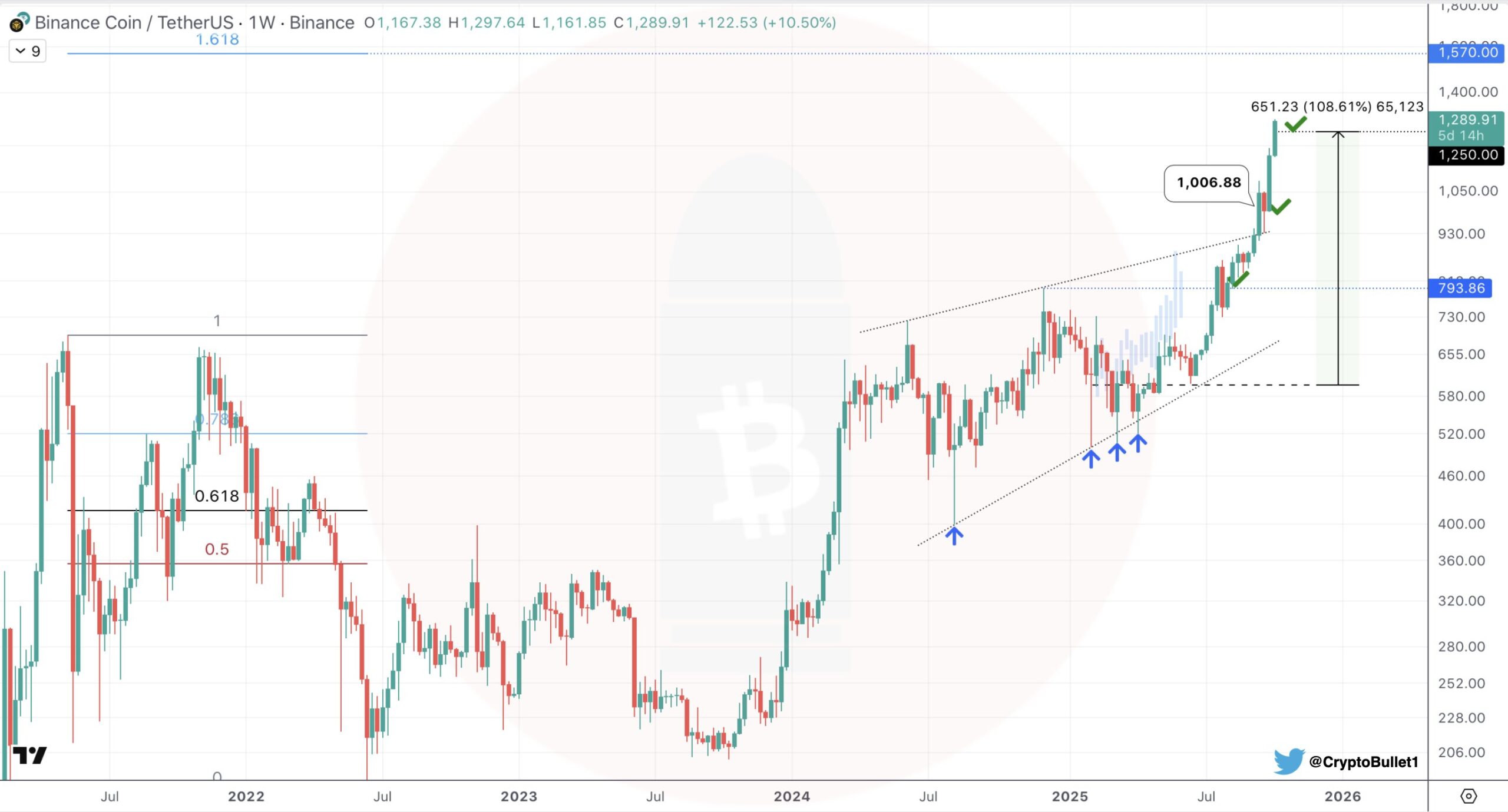 Many altcoins are experiencing price increases, largely due to Bitcoin’s closings close to its all-time high (ATH) zone. The latest ETF investments have significantly supported this trend. For months, analysts have been forecasting four-digit prices for BNB, and exceeding $1,000 had set the stage for a swift climb to $1,300.