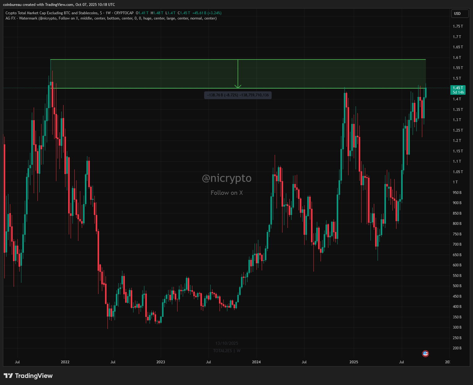 Analyst Nic pointed out that the total value of altcoins hasn’t yet reached its peak value from 2021, and a significant breakout could occur as this threshold is approached.