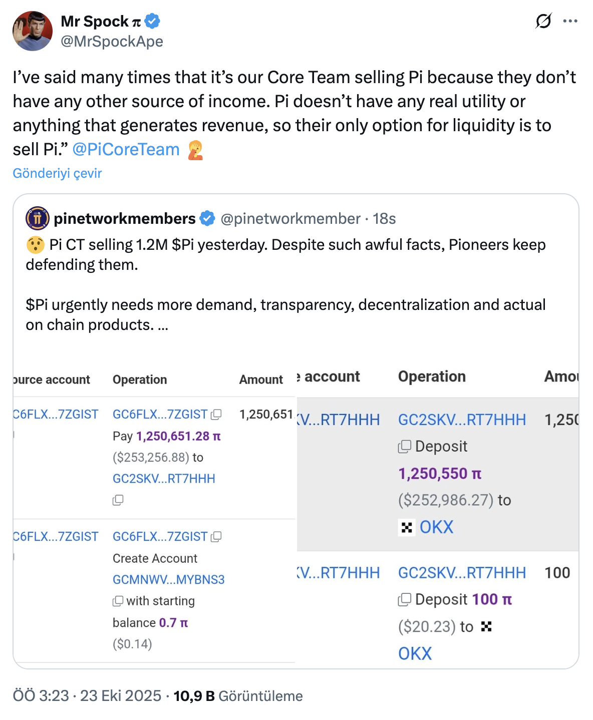 Renowned within the Pi community, Mr. Spock took to his X account to allege that the core Pi Network team was behind the sharp price drop of Pi coins. He suggested that due to the absence of a revenue-generating product or a robust ecosystem, the team resorted to selling their coin holdings to generate liquidity. Mr. Spock emphasized that cashing in their PI assets was the team’s sole financial recourse.