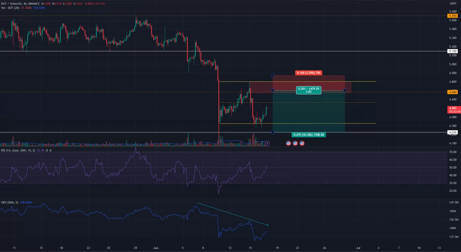 Polkadot’s failure to defend the $5.2 region against bears on June 5 was a clear sign of a strong bearish trend in the market. DOT plunged to a low of $4.2 before surging past the $4.68 support on June 10. As of writing, the trend was still in favor of sellers despite the bounce from the bottom.