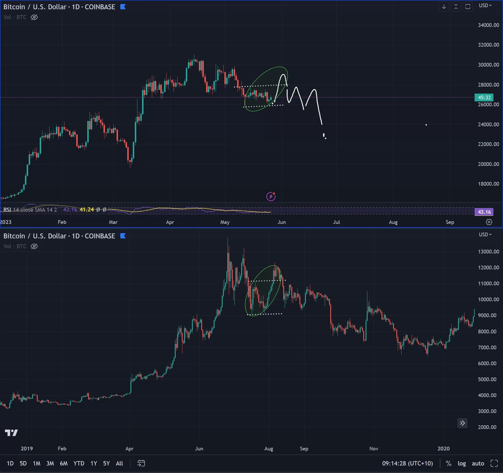 “I’m actually open to the idea of BTC bouncing slightly higher than the top of the channel, similar to 2019. This would probably provide the opportunity for altcoins to enjoy more of a rise, as some are poised to do.”