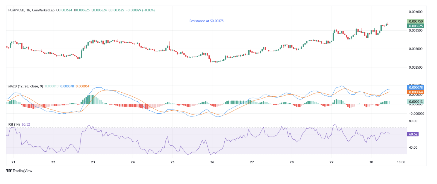 Technically, PUMP is signaling upward momentum by rising above its short-term moving averages. Indicators like RSI and MACD also point to further gains. Currently priced at $0.003625, it approaches the resistance zone of $0.00375. Breaching this level could push the price above the $0.004 mark, seen before July.