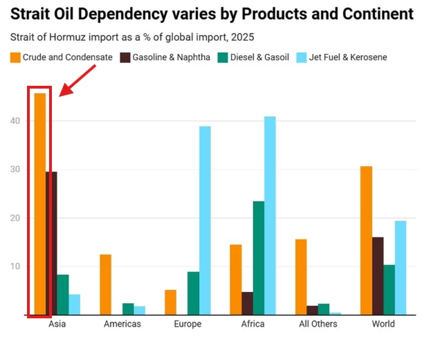 TKL highlights Asia’s extreme vulnerability: “Because Asia is highly dependent on the Strait of Hormuz, it faces the worst scenario. About 45% of all crude oil and condensate imported by Asia passes through Hormuz, the highest percentage worldwide. The region also relies on Hormuz for around 30% of gasoline and naphtha, 9% for diesel, and 5% for jet fuel.”