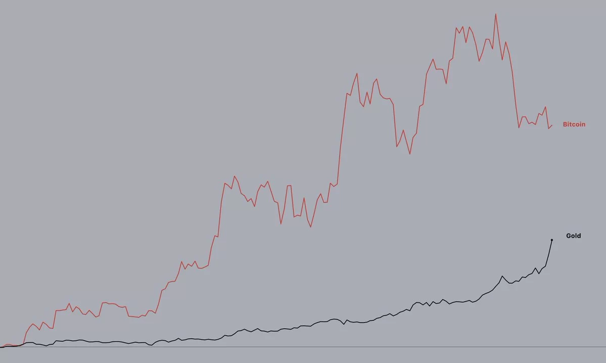 “Both Bitcoin and gold have been on a rising trend since their lowest points in October/November 2022. Despite gold’s recent gains and Bitcoin’s losses, their performances since then show: Gold increased by 241% from its lows, matching its all-time high (ATH), while Bitcoin rose by 496% from its lows, though it remains 30% below its ATH. Gold is simply trying to catch up.”