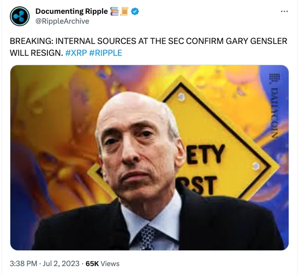 From the early hours today, a news story asserting that Gary Gensler had resigned was being circulated on Twitter. It was mentioned that this was confirmed by sources within the SEC, yet no reliable pages have corroborated the story. The claim was initially shared by leading XRP-focused accounts such as Documenting Ripple, causing a shock wave.